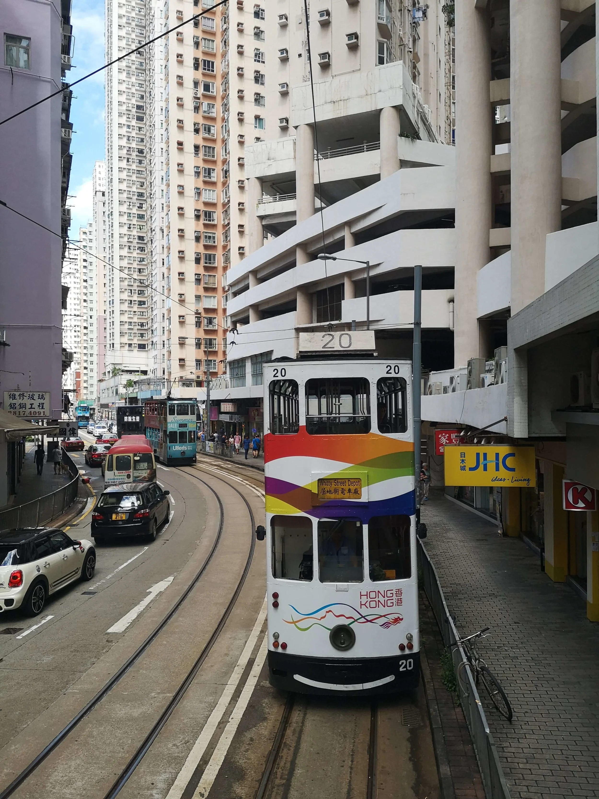 Woohoo, a friend from home! A girl I used to play volleyball with in Napier is studying here for a semester so we met up to play tourist for a day. We both use the same nerdy guidebook for HK and had read about the cheap ‘n cheerful tram ride you can do the length of Hong Kong Island so that was our first mission. They call them “ding dings” (the warning sound they make when they approach pedestrians) and they are a very fun way to check out the city. Firstly I have to mention the price, for a grand total of 50c NZ you can travel for over an hour from end to end, that is value which is hard to beat. The second thing is you are travelling above ground, as much as I love the convenience of underground rail, sometimes it’s nice to see the scenery of the city you are in. The trams themselves are also noteworthy, they are very tall and thin and often painted interesting colours and patterns and inside they are quite quaint with small wooden seats and lots of windows to watch the city roll past. We went from Central to Kennedy Town on our virgin tram ride and jumped out for a stroll once we got there. Kennedy Town is right on the water's edge and we were treated to the first of our skyline views across the harbour for the day.
