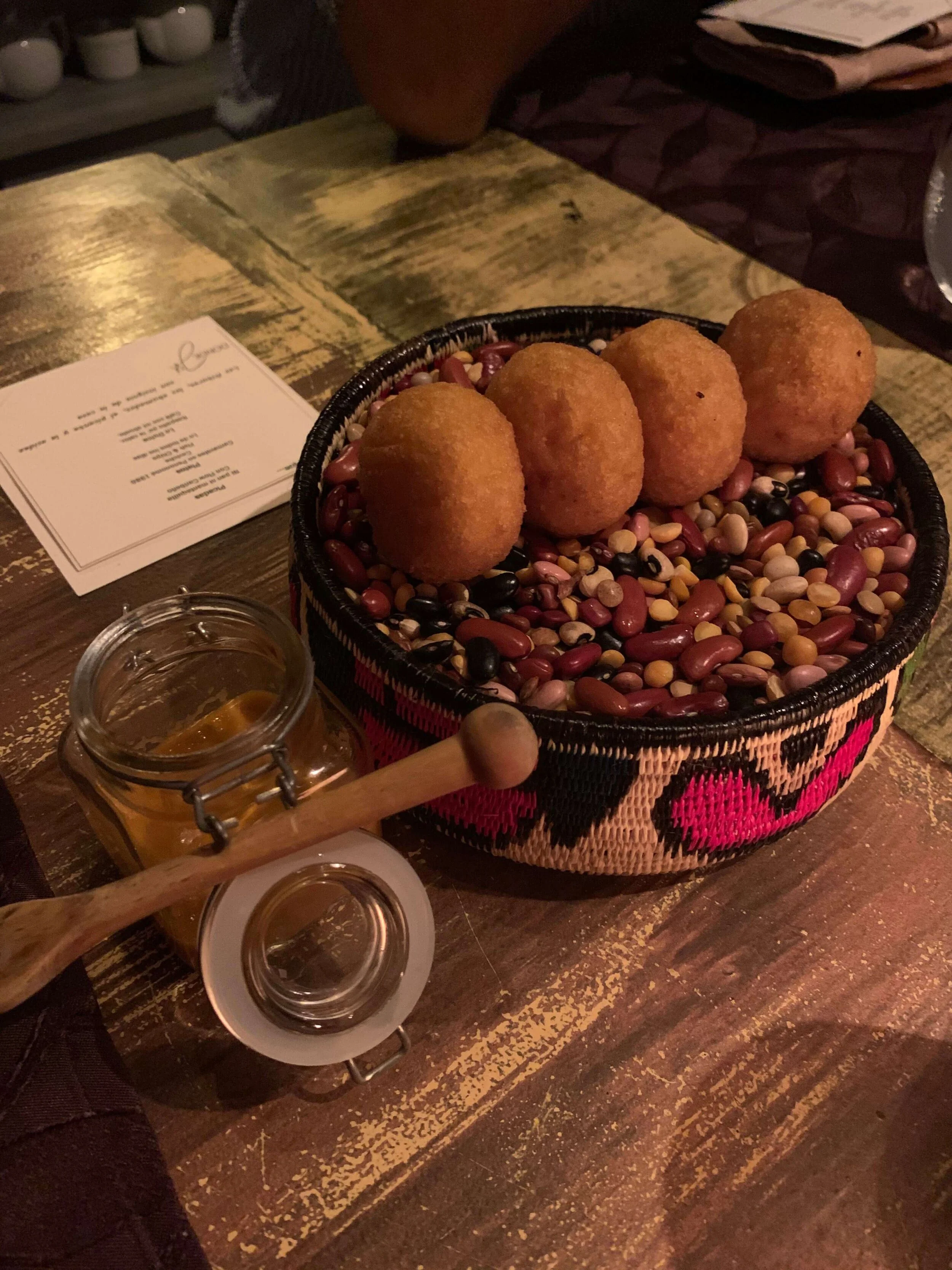 A cheese filled tiny donut type thing which we filled with a tomato-ish sauce