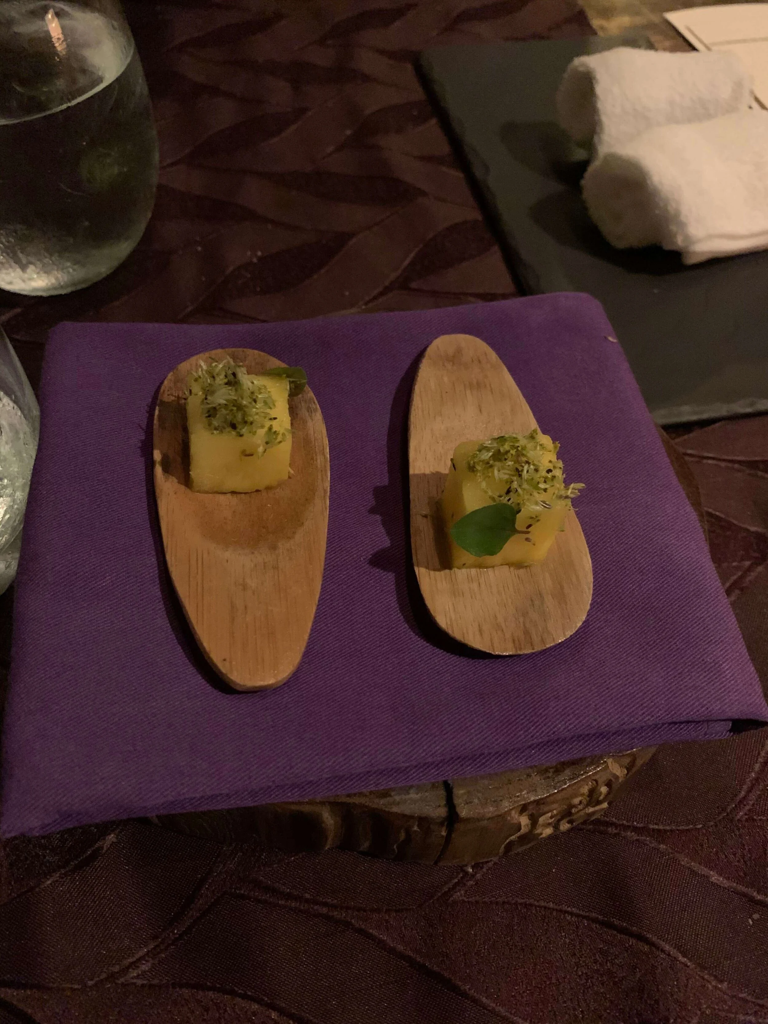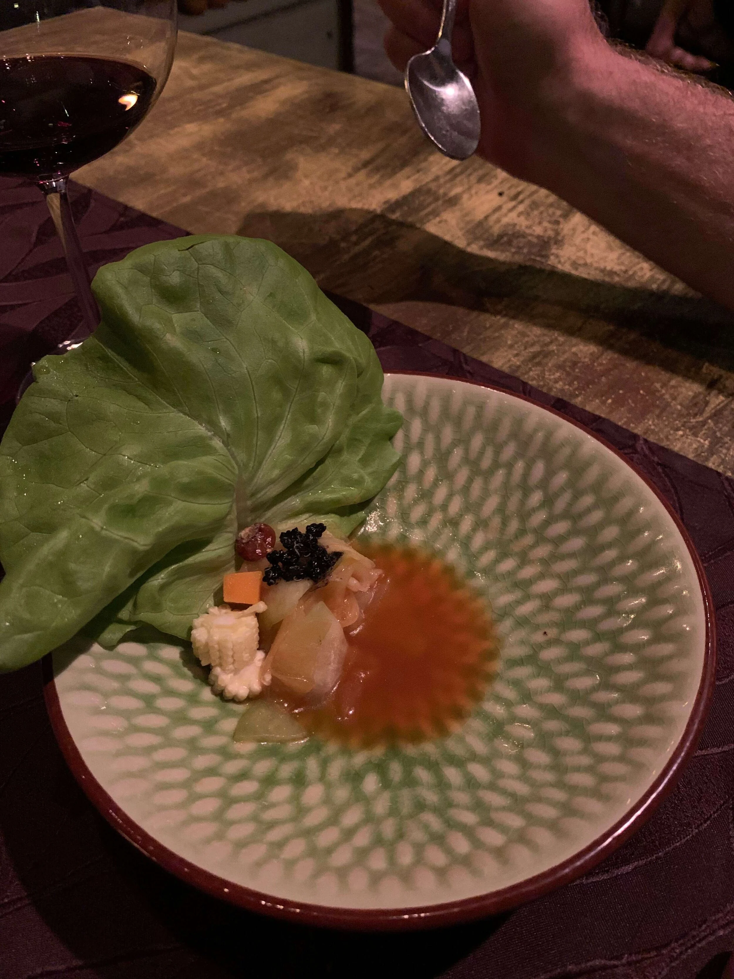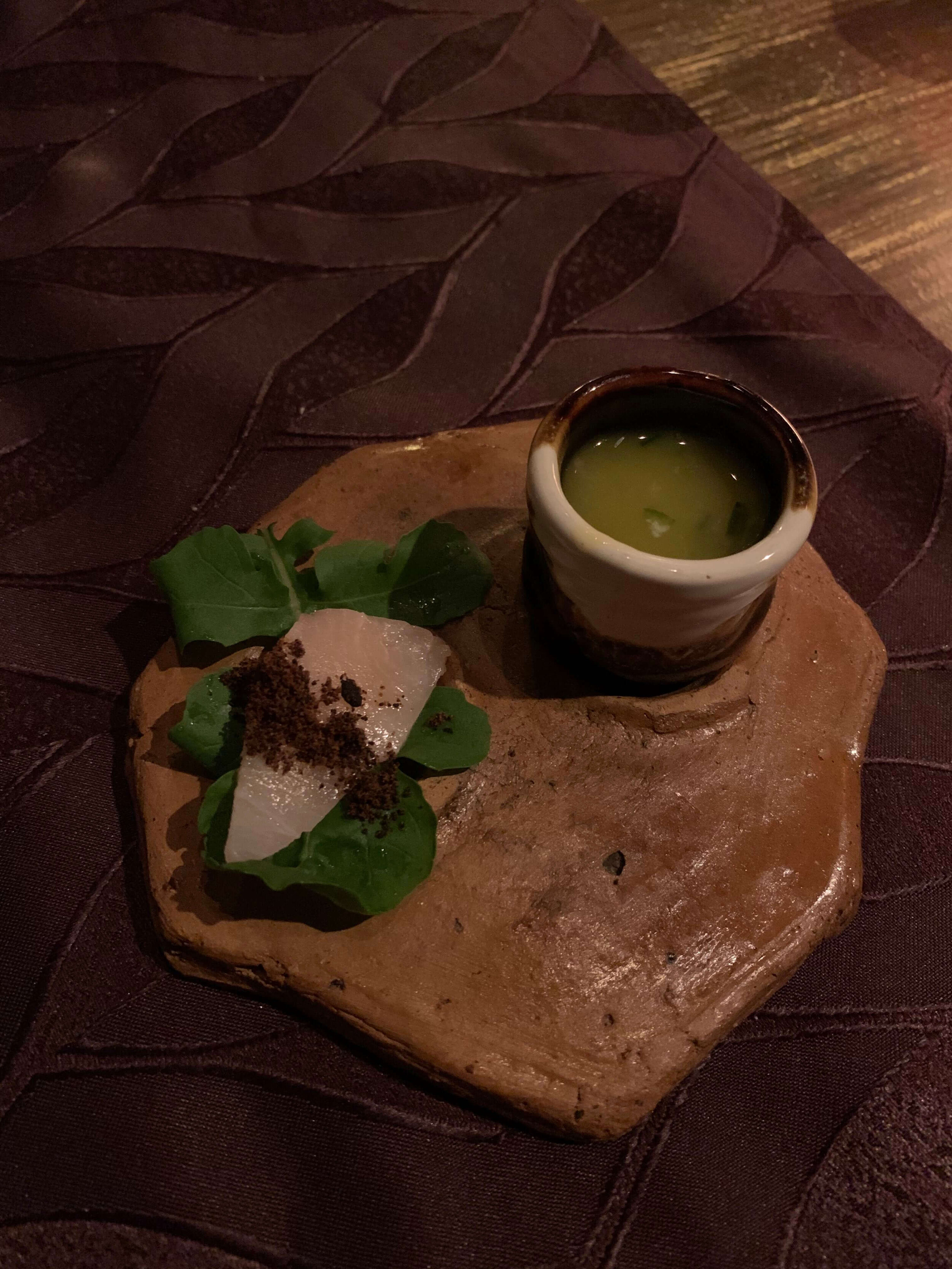 raw piece of fish with some species on it, to be wrapped in leaves, like sushi, then followed by a shot of vinegary passionfruity delicious liquid