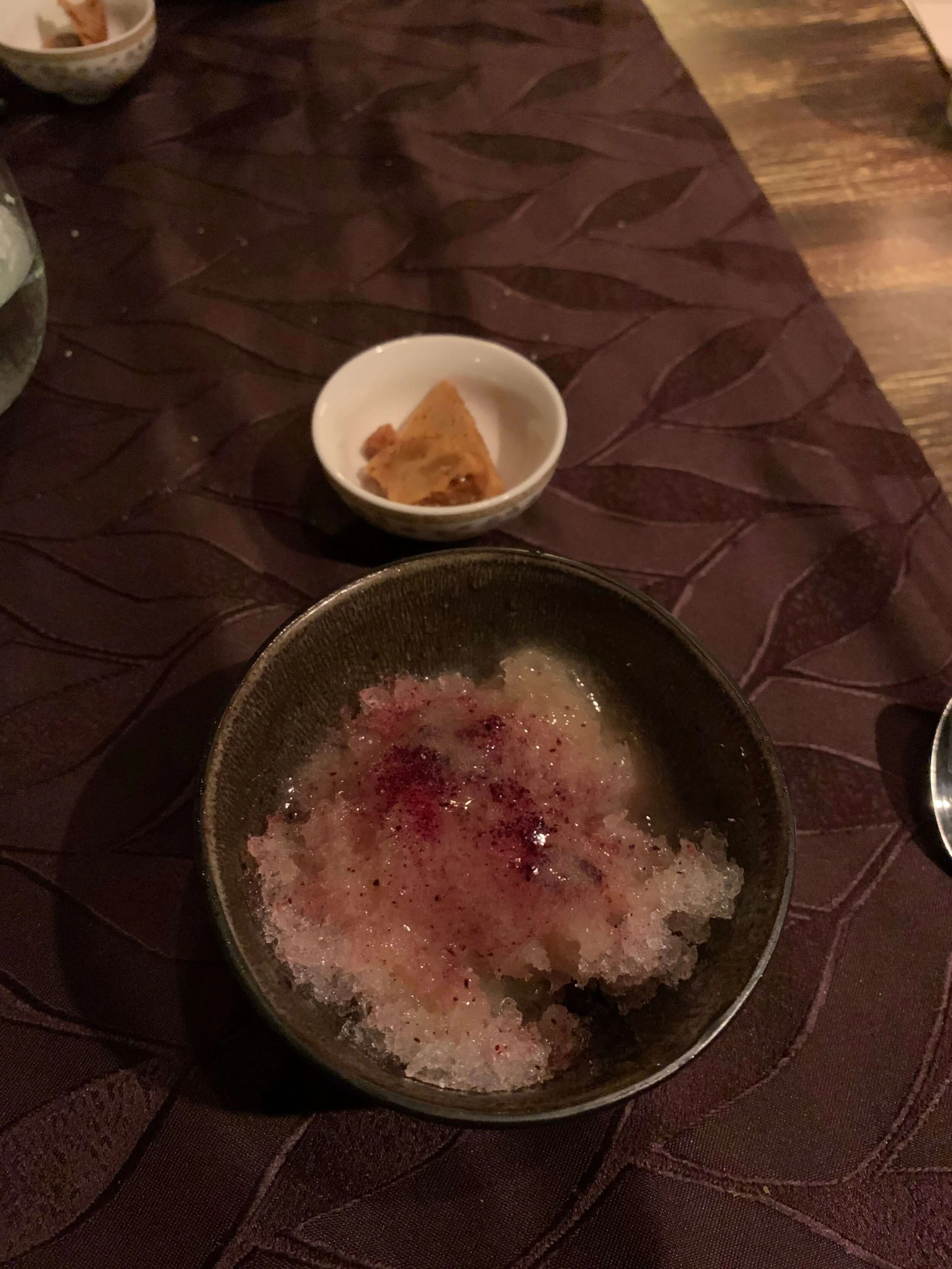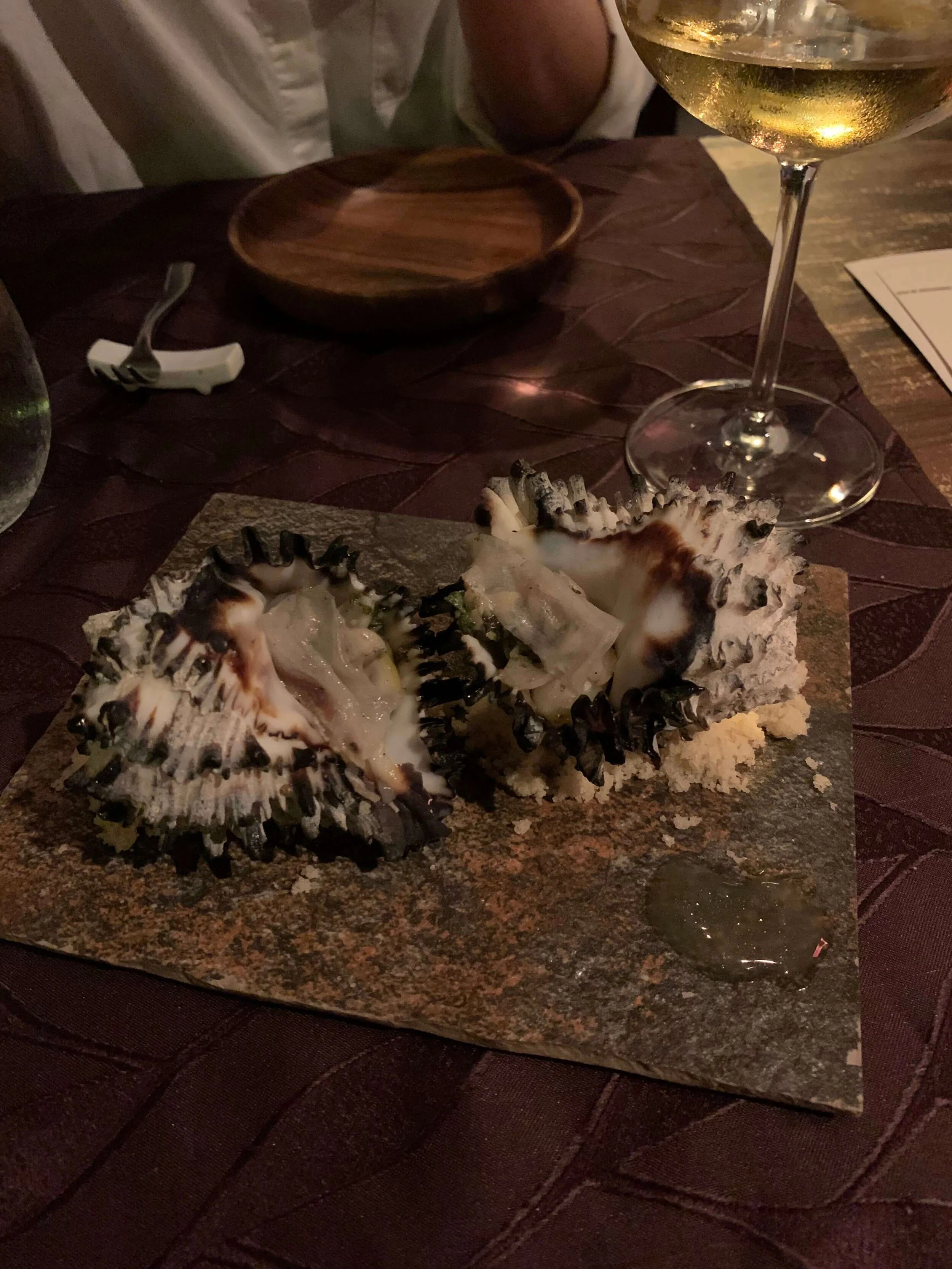 crazy spiky shells served on “sand” (think it was made from cauliflower) - we were told to stuff the sand into the shell then empty it all out and eat it - the shell had some sort of liquid and shellfish in it